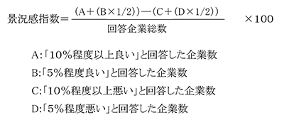 景況感指数とは、「良い」の割合から「悪い」の割合を差し引いた値を指数化したもので、次の数式により指数を算出する。