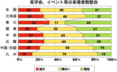 地域別では、「やや広くなっている・広くなっている」の割合は、北海道(前22%から27%に)、中部(前11%から23%に)、中国・四国(前13%から31%に)、の3地域が増加しているが、4地域は減少。「変わらない」の割合が、北海道(前67%から46%に)東北(前69%から67%に)以外の5地域が横ばいもしくは増加しているという事が、全体的な傾向を表している。