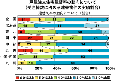 全国では、「50%以上」(前32%から30%に)が微減し、「40%未満」(前48%から48%に)は横ばいとなっており、建替え受注は現状維持という状況である。