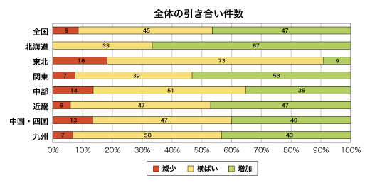 地域別では、関東、中部、九州の3地域で「増加」が「減少」を上回っているが、北海道以外の地域で「横ばい」が最大値を占めている。