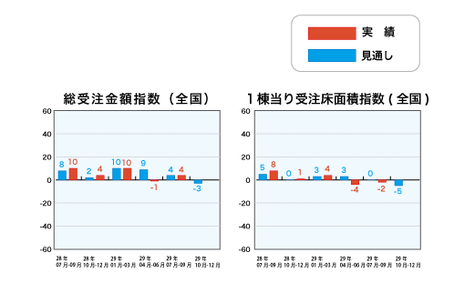 平成29年7~9月の受注実績指数は、平成29年4~6月(以下、前四半期)比で、前四半期予測の(総受注戸数 +15ポイント、総受注金額 +4ポイント)に対し、全国平均では