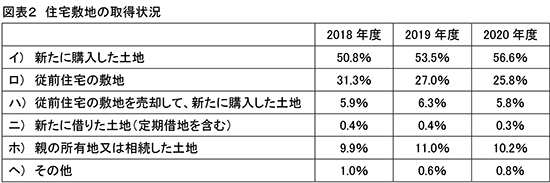 - ・住宅敷地の取得状況別にみると「従前住宅の敷地」に新築した割合は1.2ポイント低下、「新たに購入した土地」に新築した割合は3.1ポイント増加した。(図表2)