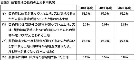 - ・住宅敷地の従前土地利用状況は、「契約時又は以前に住宅が建っていた土地」が56.2%を占め、「契約時に住宅以外の建物だった土地」の6.8%と合わせると、全体の63.0%が従前から建物があった宅地となっている。(図表2)